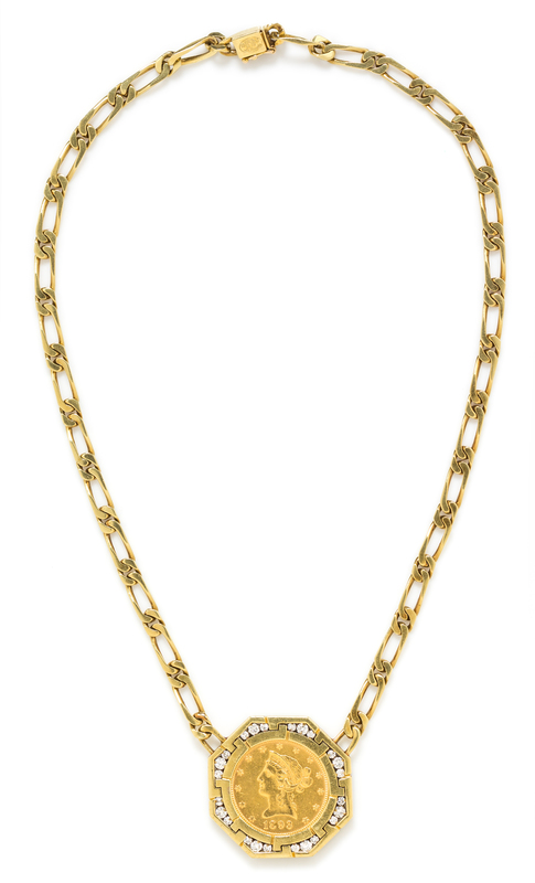 containing a US $10 dollar Liberty head gold coin, dated 1893, within a textured bezel containing 24 round brilliant cut diamonds weighing approximately 1.50 carats total with attached Figaro link chain. Stamp: 18KT La Triomphe (maker's mark).