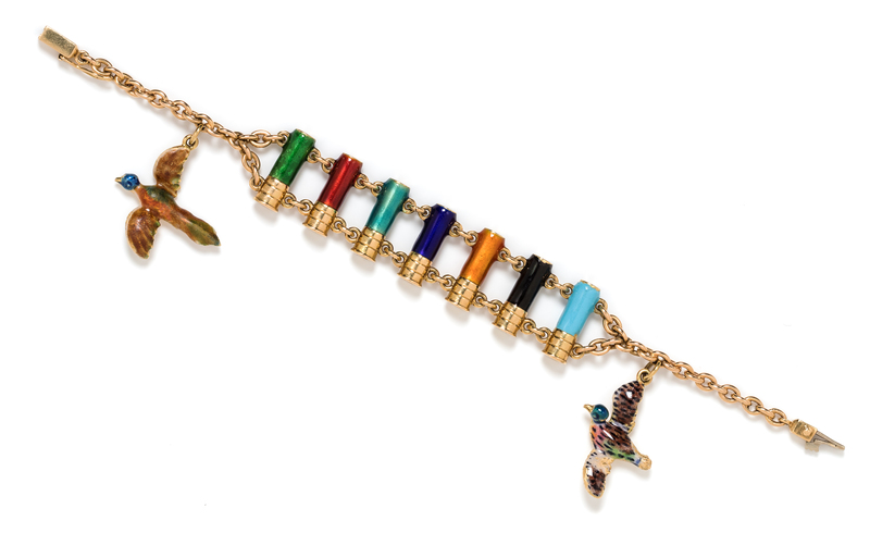 consisting of a series of shotgun shell shaped links with opaque and translucent polychrome enamel in shades of light blue, black, orange, blue, aqua, red and green, on either end are suspended two polychrome enamel bird charms.