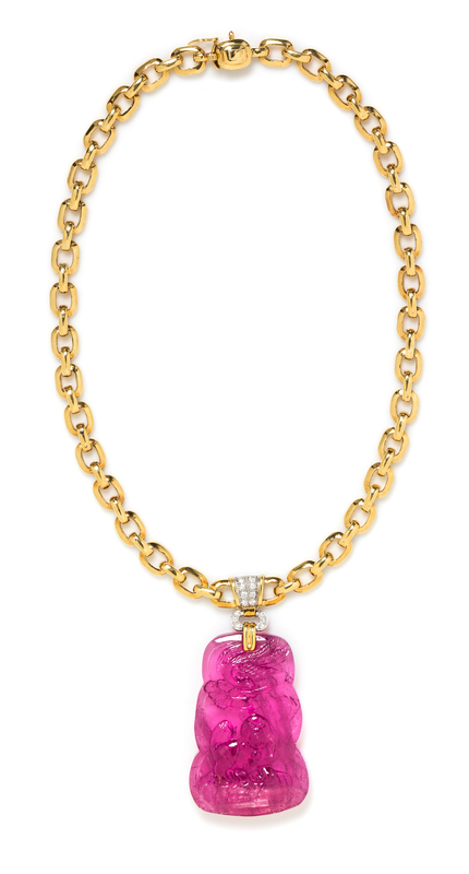An 18 Karat Bicolor Gold, Carved Pink Tourmaline and Diamond Necklace, Trio,