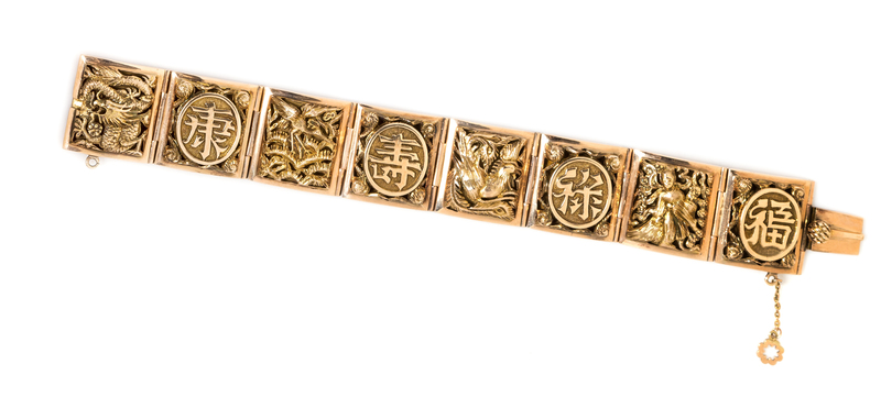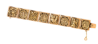 consisting of eight hinged links of pierced and highly engraved motifs including a dragon, crane, phoenix and a god, alternating with plaques saying good fortune, longevity and wealth.Stamp: 18K.