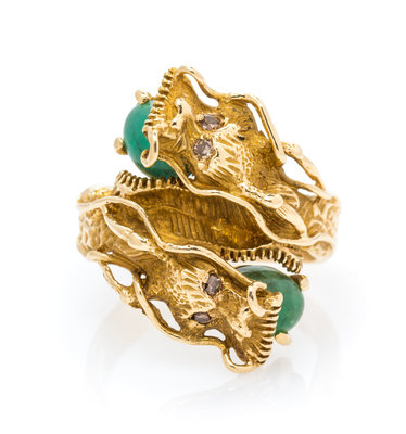 consisting of opposing dragon heads in a bypass design, containing two oval shape cabochon cut emeralds and four round brilliant cut colored diamonds (origin of color not tested) weighing approximately 0.08 carat total.Stamp: 14K (maker's mark) 170.