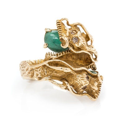 A 14 Karat Yellow Gold, Emerald and Colored Diamond Dragon Motif Ring,