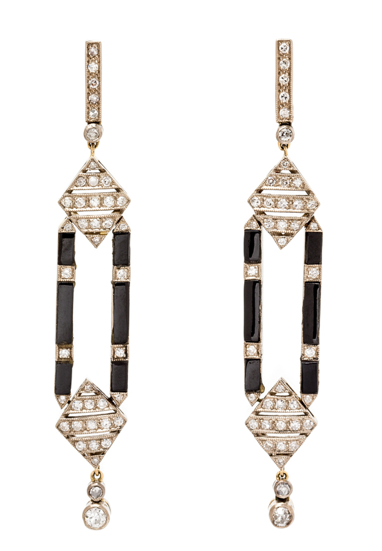 A Pair of Art Deco Platinum, Diamond and Onyx Drop Earrings,