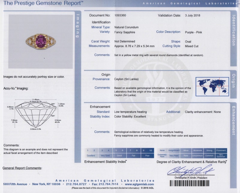 containing one oval mixed cut purple-pink sapphire measuring approximately 8.76 x 7.29 x 5.34 mm and 38 round brilliant cut diamonds weighing approximately 0.55 carat total.Stamp: 8(obscured).Accompanied by an American Gemological Laboratories sapphire identification certificate number 1093360, dated July 3, 2018, stating Mineral type: Natural Corundum, Variety: Fancy Sapphire, Color: Purple-Pink, Enhancement: Low temperature heating.