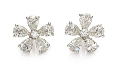 A Pair of 18 Karat White Gold and Diamond Flower Earrings,