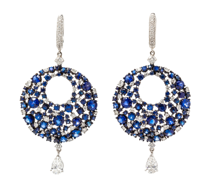 containing two pear brilliant cut diamonds weighing approximately 1.00 carat total suspended from open circle pendants containing 120 round brilliant cut diamonds weighing approximately 1.75 carats total and numerous round mixed cut sapphires weighing approximately 9.30 carats total.Stamp: K18 750 MARIANI.