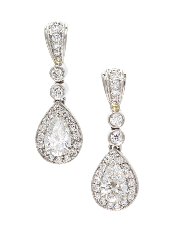 containing two pear shape diamonds weighing approximately 0.80 carat total and numerous round brilliant cut diamonds weighing approximately 0.31 carat total.Stamp: Beaudry 900PT.