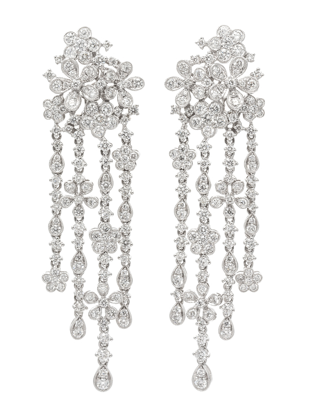 A Pair of 18 Karat White Gold and Diamond Floral Cluster Fringe Earclips,