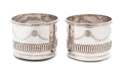 each having a reeded rim, the pierced bodies worked to show bellflower swags suspended from lion masks, with turned wood bases.