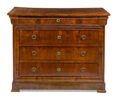 in the Louis Philippe taste, having a rectangular top above a frieze drawer and three long drawers with ring pulls, raised on a bracket base.