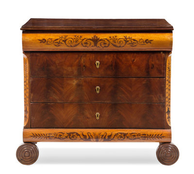 having a rectangular top with a molded edge above a frieze drawer of convex outline inlaid to show foliate scrolls and three long drawers, raised on spiral carved circular fore-feet.