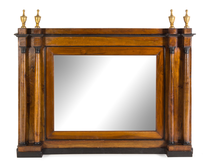 of breakfront outline, the mirror plate of horizontal rectangular form and flanked by four columnar pilasters surmounted by baluster form finials.