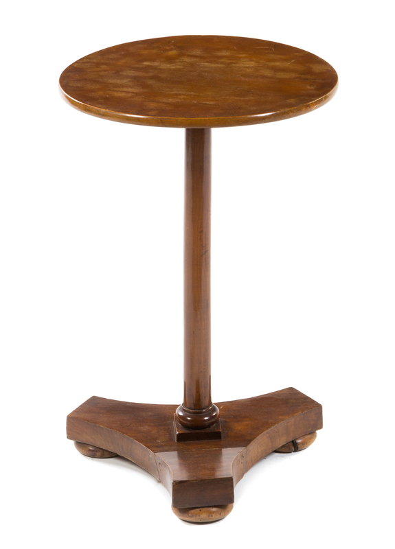 having a circular top above the cylindrical stem, raised on a tripartite base ending in flattened bun feet.