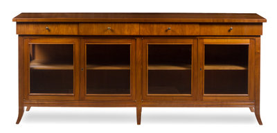 having a rectangular top above four aligned drawers and four glazed doors opening to a shelved interior, raised on splayed legs.