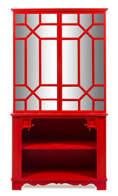 in two parts, the superstructure having a molded projecting cornice above mirrored doors with mullions opening to a shelved interior, the base having an open niche fitted with a shelf, raised on bracket feet.