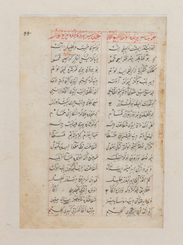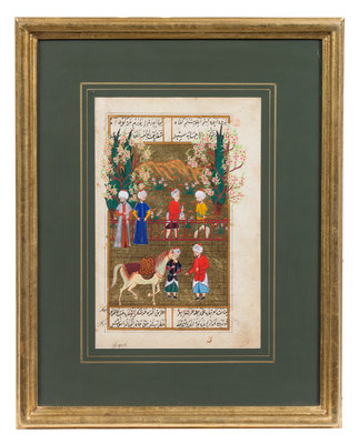 depicting turbaned figures and a horse in a garden setting, the verso with 17 lines of text within two columns, matted and framed.
