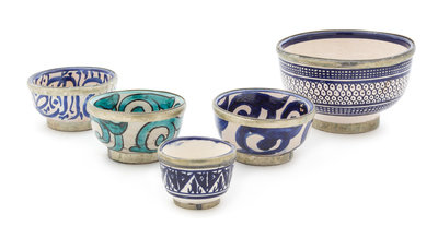 comprising five bowls of various sizes and decoration.