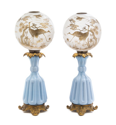 A Pair of Italian Gilt Metal Mounted Glass Fluid Lamps