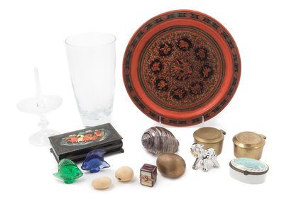 comprising a glass vase, a glass finial or ring stand, a silver-clad shell, a Burmese lacquered tray, a pair of brass snuff box candle holders, a Russian lacquer box and others; 15 items total.