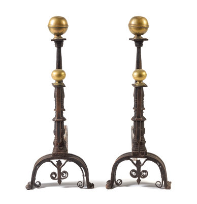 A Pair of Italian Baroque Brass and Iron Andirons