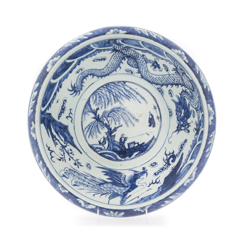 the well depicting two figures in a landscape within a border depicting a writhing dragon chasing the flaming pearl.