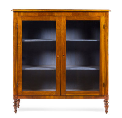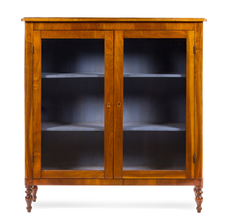 the rectangular top with rounded fore-corners above two glazed doors opening to two shelves, raised on turned cylindrical legs.