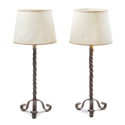 each having a twisted stem terminating in a tripod base, mounted as lamps with parchment shades.