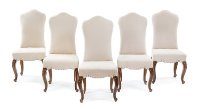 in the Louis XV taste, each having a padded back and stuffover seat with nail heads, raised on rocaille carved cabriole legs ending in scrolled toes.