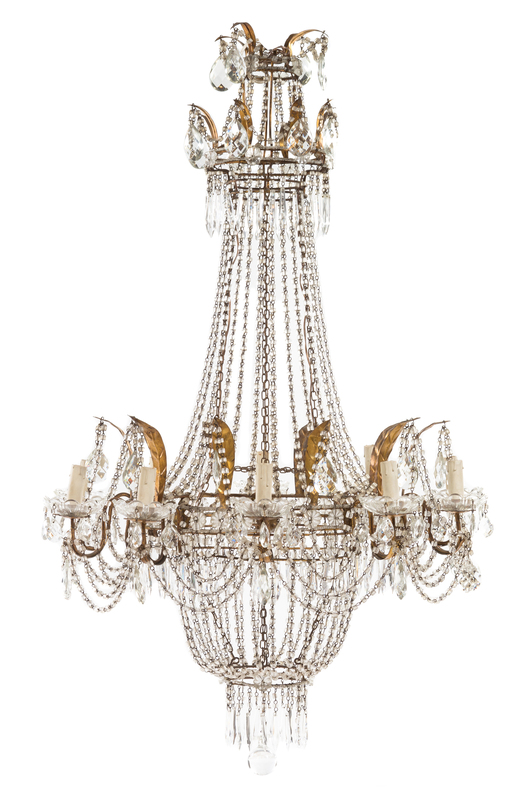 having a foliate cast corona issuing chains suspending a circular frame fitted with ten candle arms, hung with prisms and swags throughout.