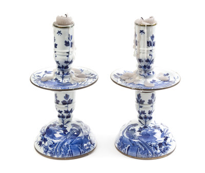 A Pair of Chinese Export Blue and White Porcelain Convertible Candlesticks