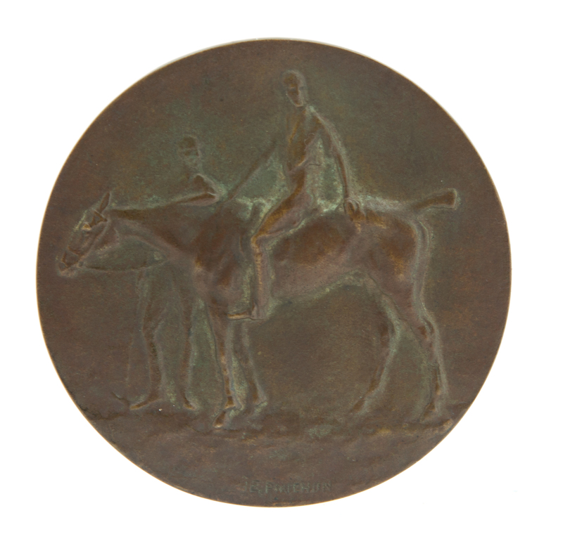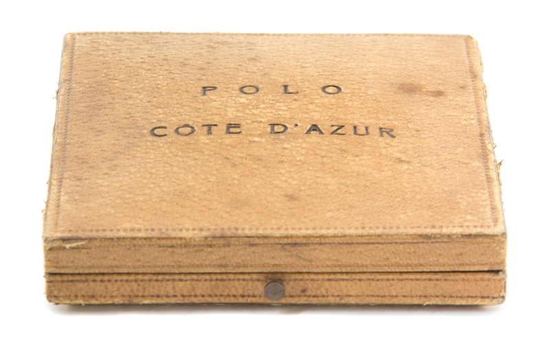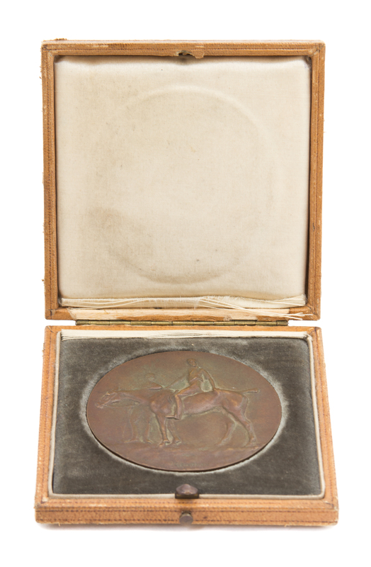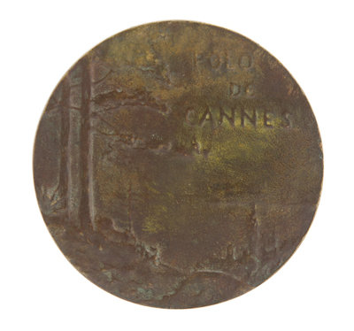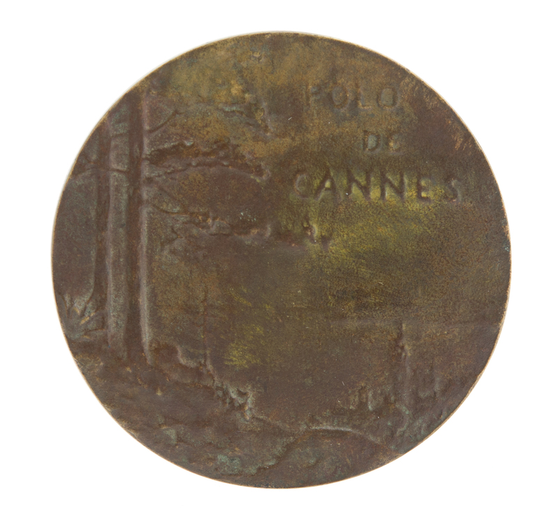 Polo de Cannesbronze medallion with polo players and pony on face, the verso with a wooded landscape opening to the sea; in a fitted leather box inscribed Polo/Cote D'Azur