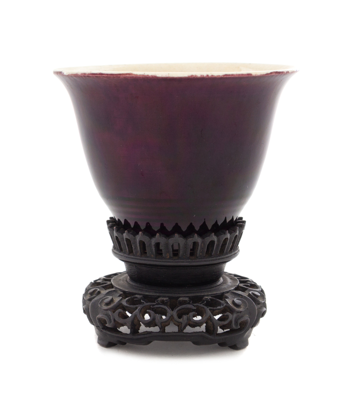 having rounded walls raised on a short foot, surmounted by a flared mouth, set atop a fitted hardwood stand.