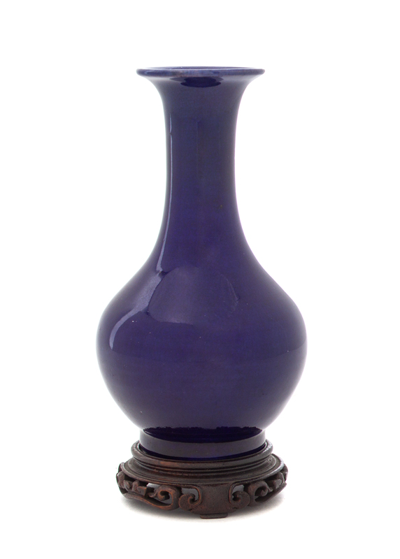 the globular body raised on a short straight foot, surmounted by a tall cylindrical neck and a flared mouth.