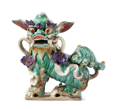 A Chinese Green, Aubergine and Yellow Glazed Pottery Fu Lion-Form Roof Tile