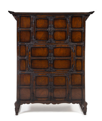 of rectangular form, the top panel ending in two protruding terminals, above three pairs of pull-out doors opening to big drawers, all supported on a rectangular base above square sectioned feet, with iron mounts.