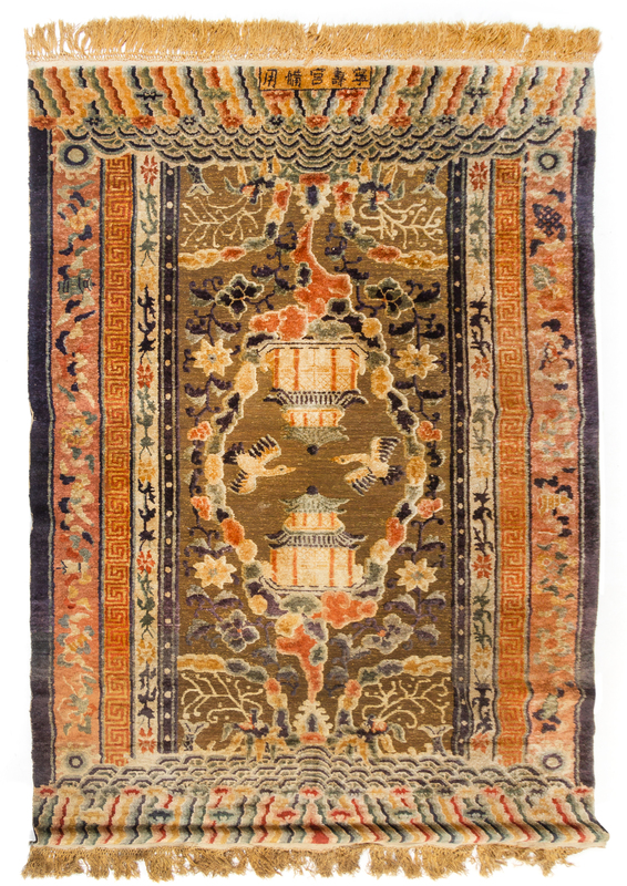 of large retangular form, finely woven with metallic threads depicting two pavilions and a pair of cranes surrounding by lotus scrolls against a brown ground, the borders with flowering branches and keyfret bands, the top register embroidered with five characters reading Ningshou Gong beiyong ("For the use in the Palace of Heavenly Tranquility").