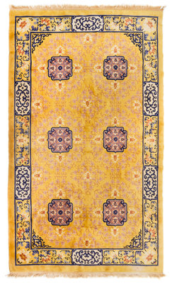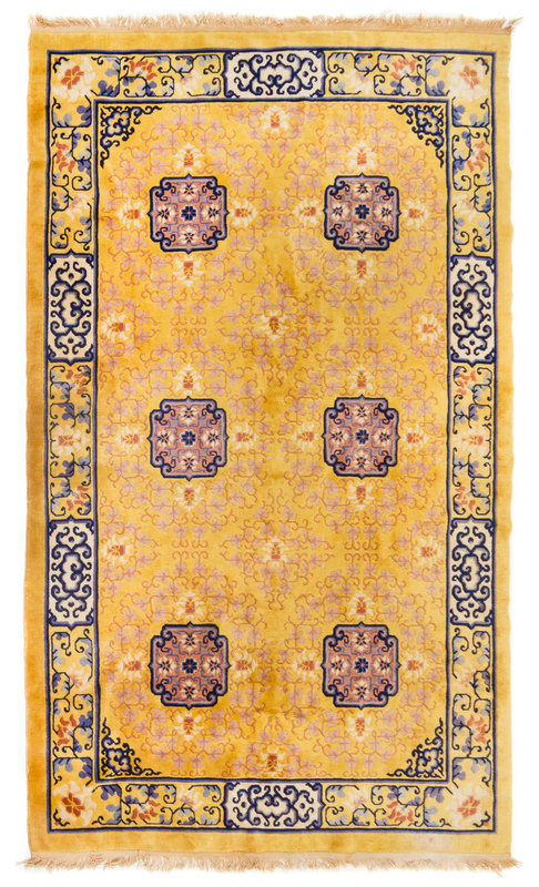 of rectangular form, having six floral panels enclosed by lotus scrolls, further circled by a floral border, all reserved on a yellow ground.