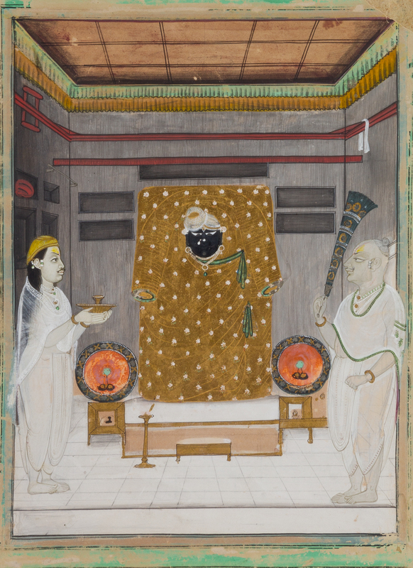 depicting Srinathji with two attendants, opaque watercolor and gold on paper.