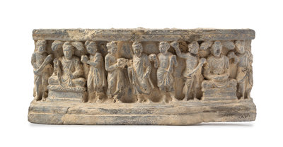 of rectangular form, carved in relief showing two seated Buddha figures surrrounded by attendants.