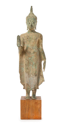 the figure cast standing with the right hand raised and the left hand stretched along the body, dressed in draped robes, the face bearing a serene expression underneath tight knots and surmounted by a tall flame-form ushnisha.