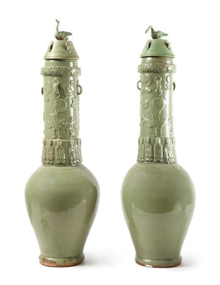 A Pair of Longquan Celadon Glazed Porcelain Funerary Urns and Covers