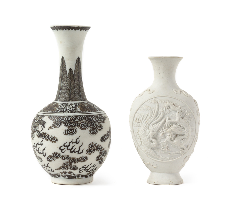the first a black enameled example, the globular body carved with a sinuous dragon amongst clouds above a fish in waves, the shoulder decorated with blooming peonies underneath lappet leaves, the underside incised with a black enameled Qianlong six-character mark; the second a white example, the flattend body carved on both sides with two medallions showing confronting phoenix and dragons amidst clouds, divided by four be-ribboned auspicious emblems, the underside incised with an apocryphal Qianlong six-character mark.