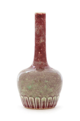 the globular body rising to a tall cylindrical neck, molded with a row of petals above the foot, the underside unglazed.