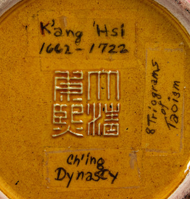 the baluster body having broad shoulders tapering to a slightly spreading foot, surmounted by a short neck and a lipped mouth, the shoulder carved with eight trigrams, the underside carved with a Kangxi four-character mark.