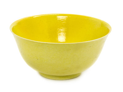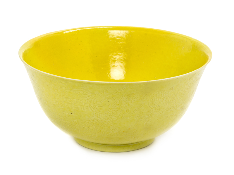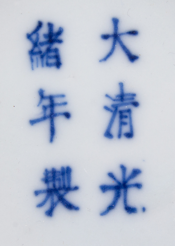 having deep rounded walls, rising from a short straight foot to a lipped mouth, the exterior carved with flying phoenix and dragons above waves, the underside bearing a Guangxu six-character mark in underglaze blue.