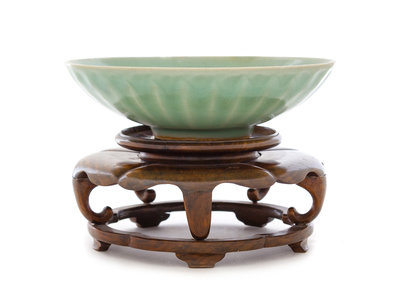 having shallow rounded walls, the exterior molded with overlapping lotus petals, covered in a blue-green glaze, raised on a fitted wood stand well carved with leaf motif.