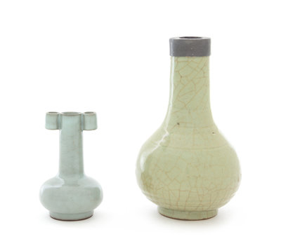 the first a longquan celadon glazed example, the bulbous body surmounted by a tall neck, having a metal mounted mouth and a network of light russet crackles; the second a guan- type example, the compressed body rising to a tall neck flanked by a pair of lug-form handles.