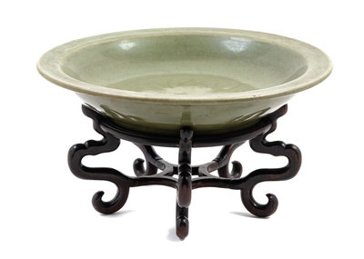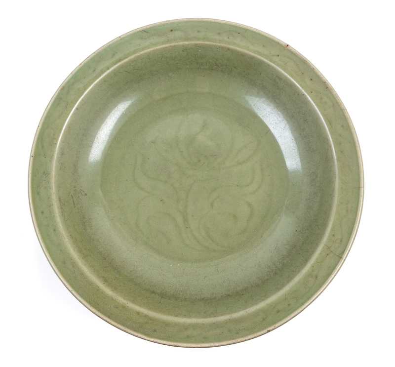 of circular form, the sloping walls raised on a short foot ring, surmounted by an everted caveto, the central interior carved with a flower blossom, the base having a ring of orange burnt.