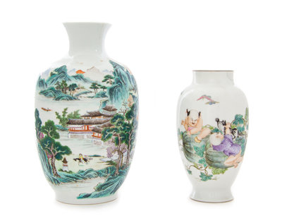 each having a baluster body, the first decorated with a continuous riverscape scene, the base drilled; the second showing two children playing with a cat atop melons, the underside incised with an iron red four-character mark reading "Hongxian yuzhi".