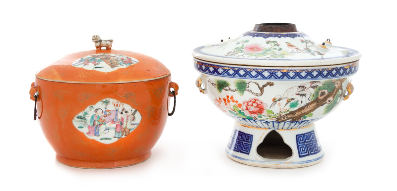 the first a gilt decorated coral red ground famille rose covered bowl, decorated with shaped reserves enclosing figures, interspersed with gilt highlighted bats, flanked by a pair of metal handles and surmounted by a fu dog-form finial; the second an underglaze blue and famille rose hot pot showing birds perched on flowering trees.